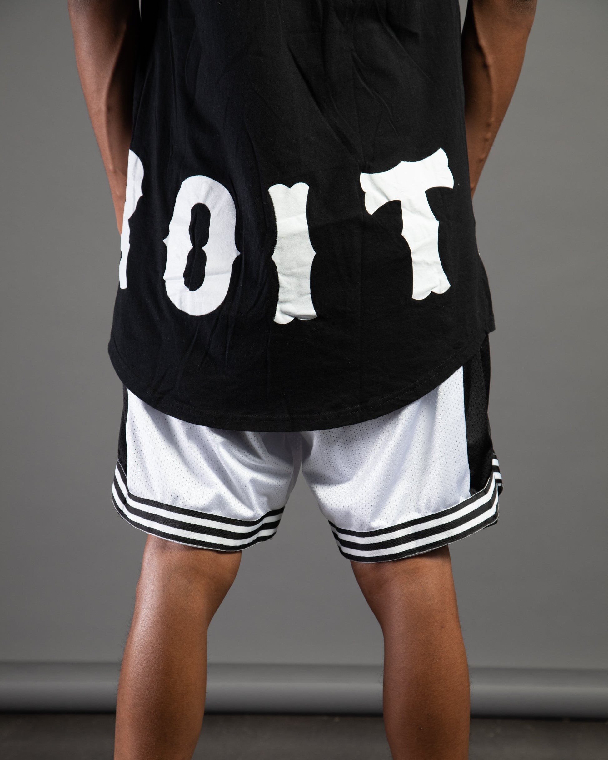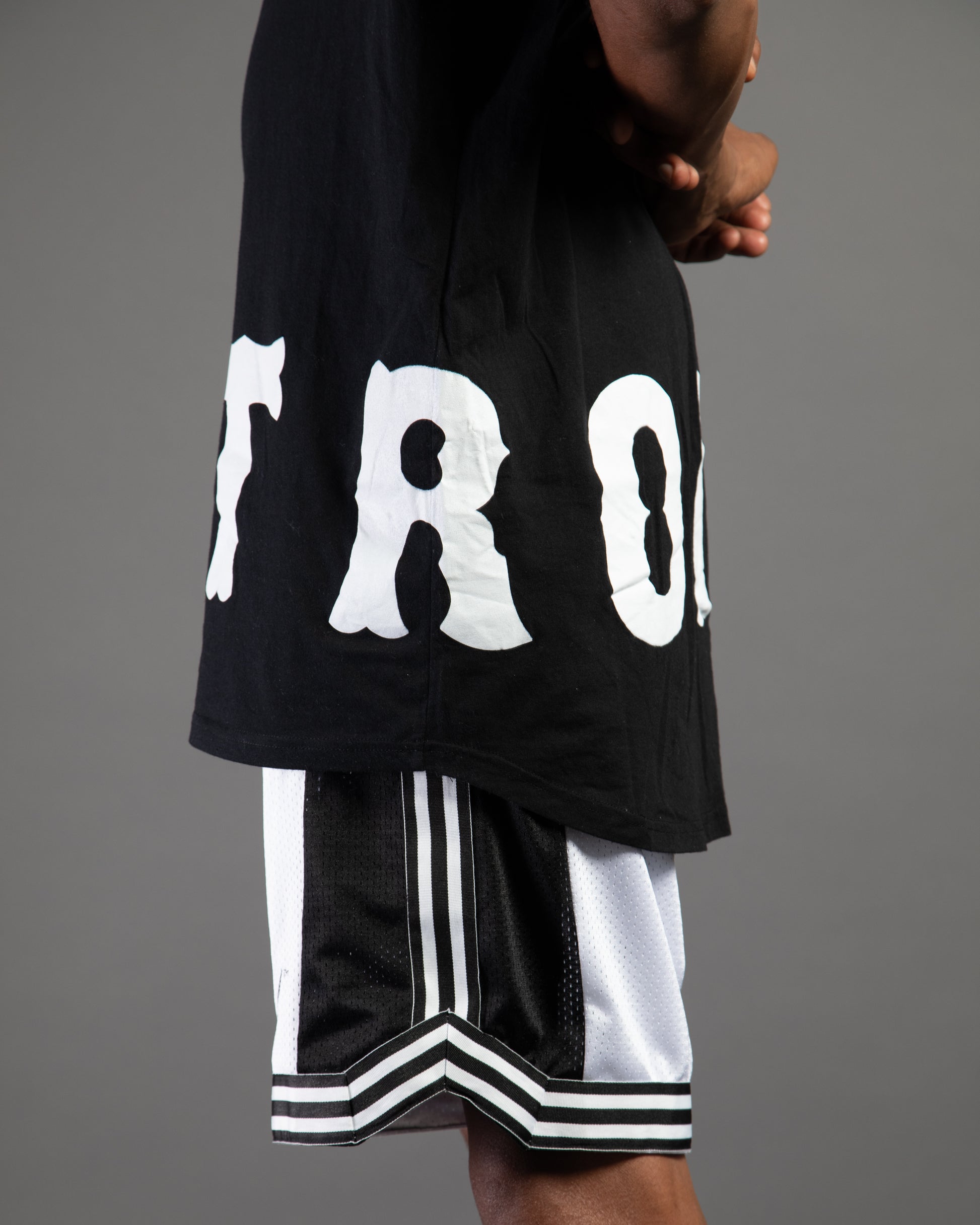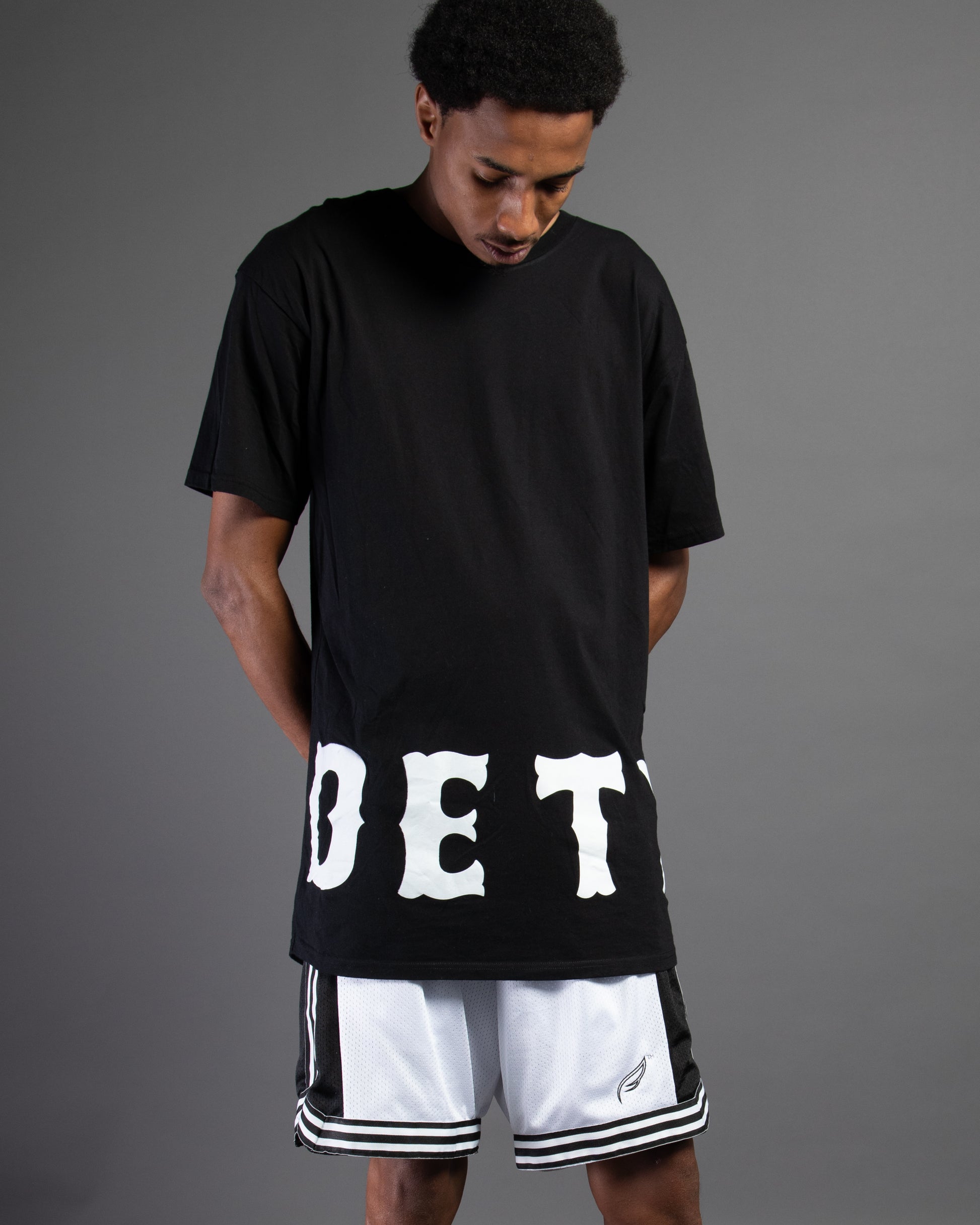 Slim fit. Extra long. Scoop cut. Wraparound "Detroit" DTG.