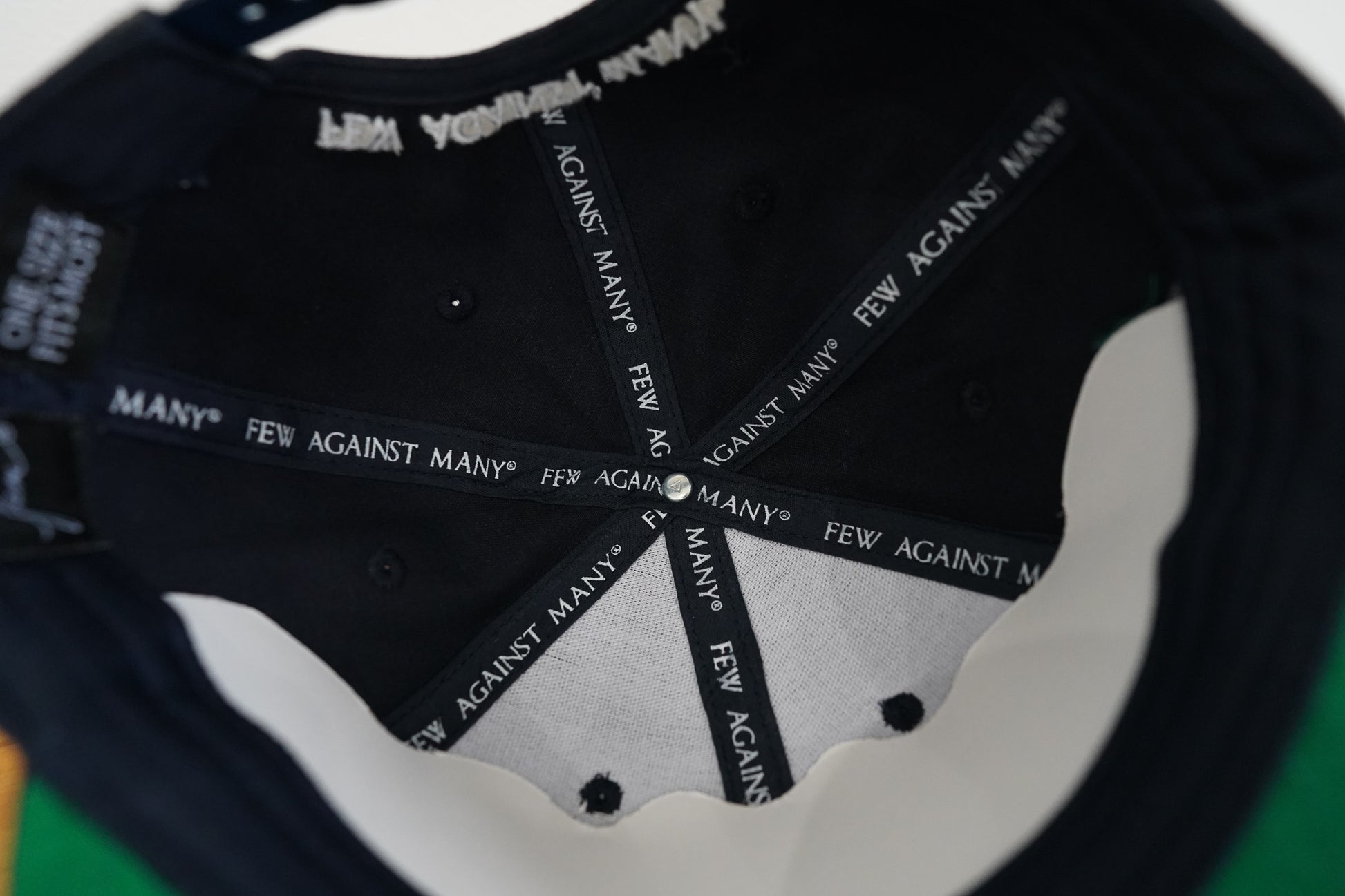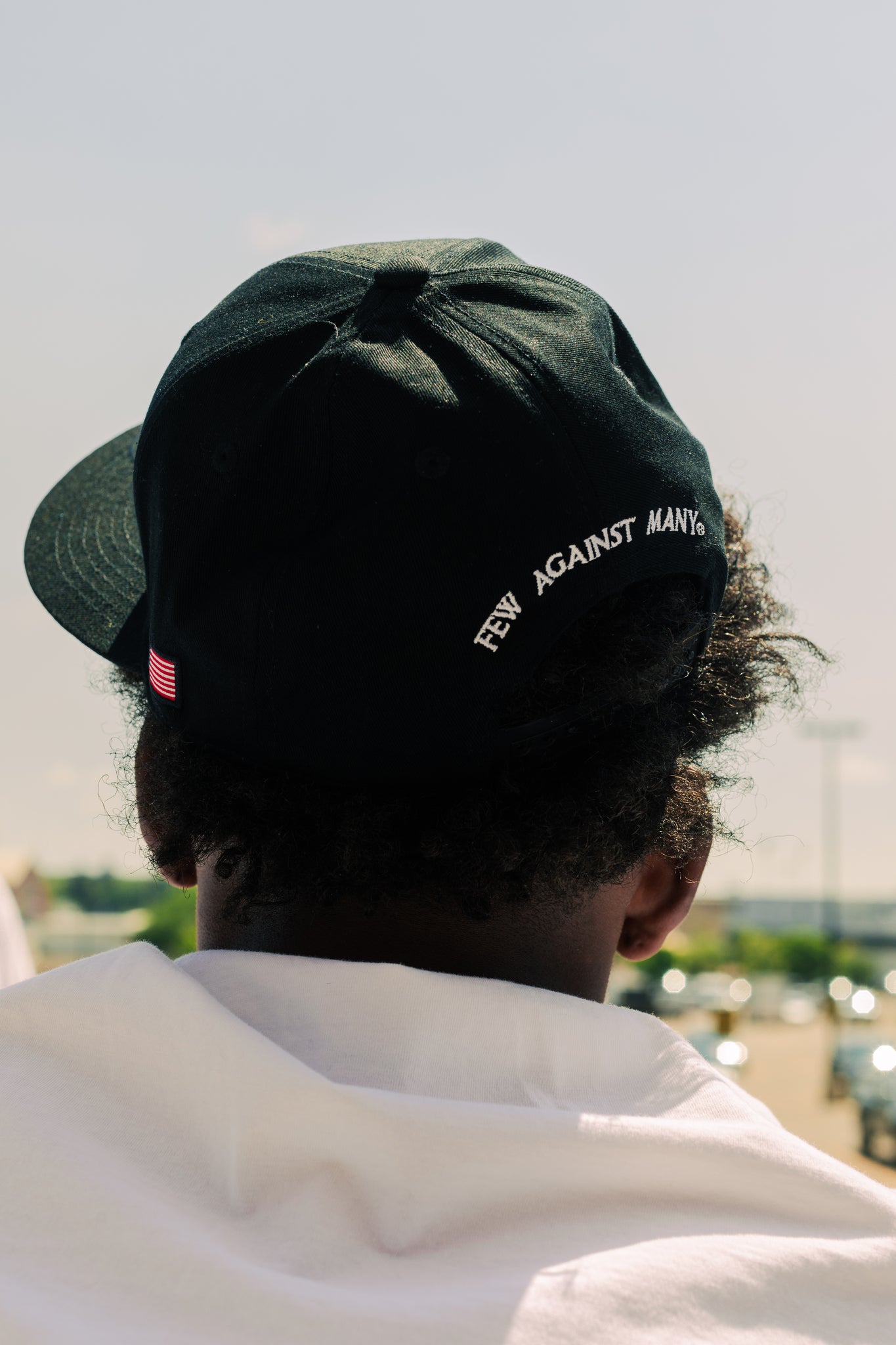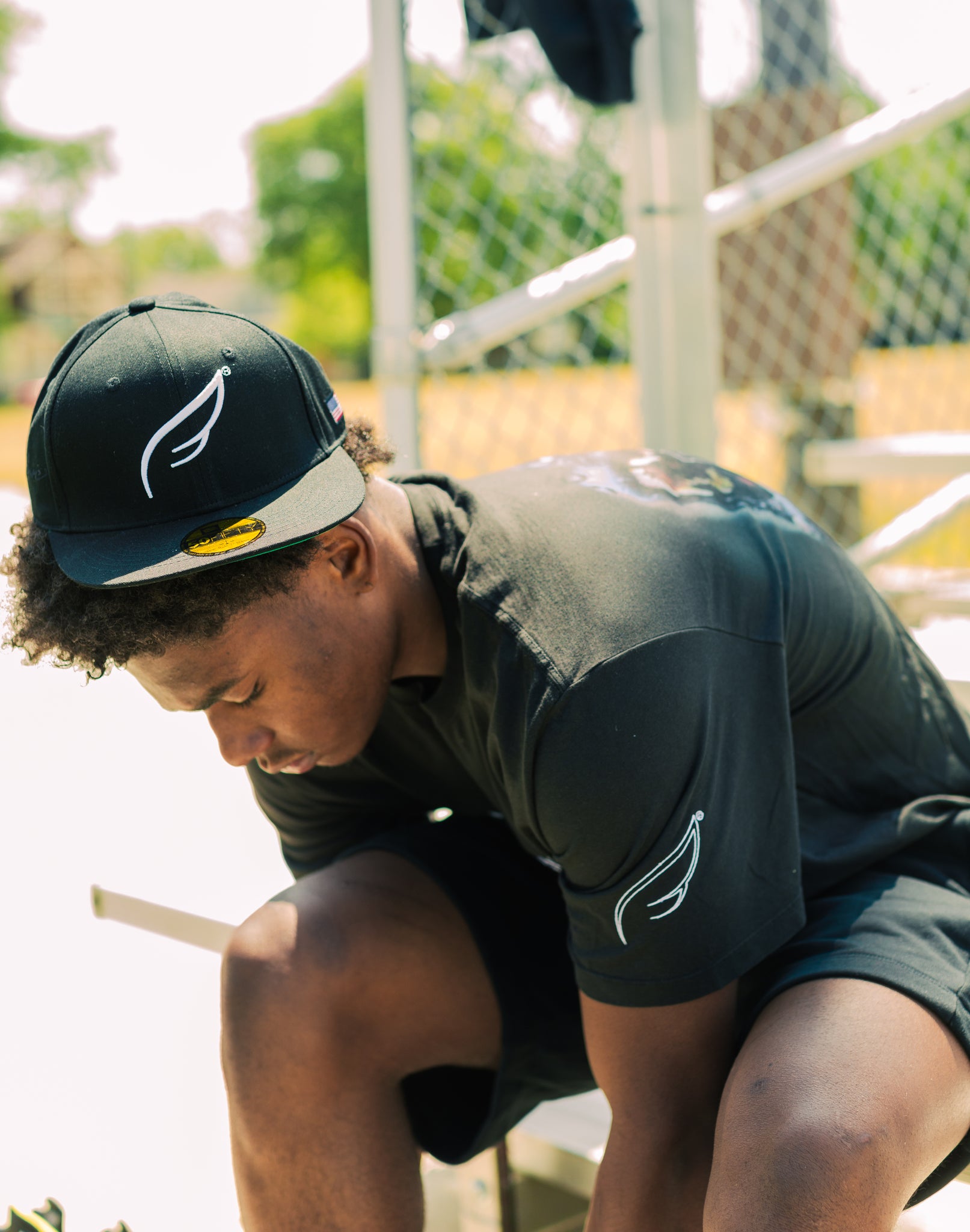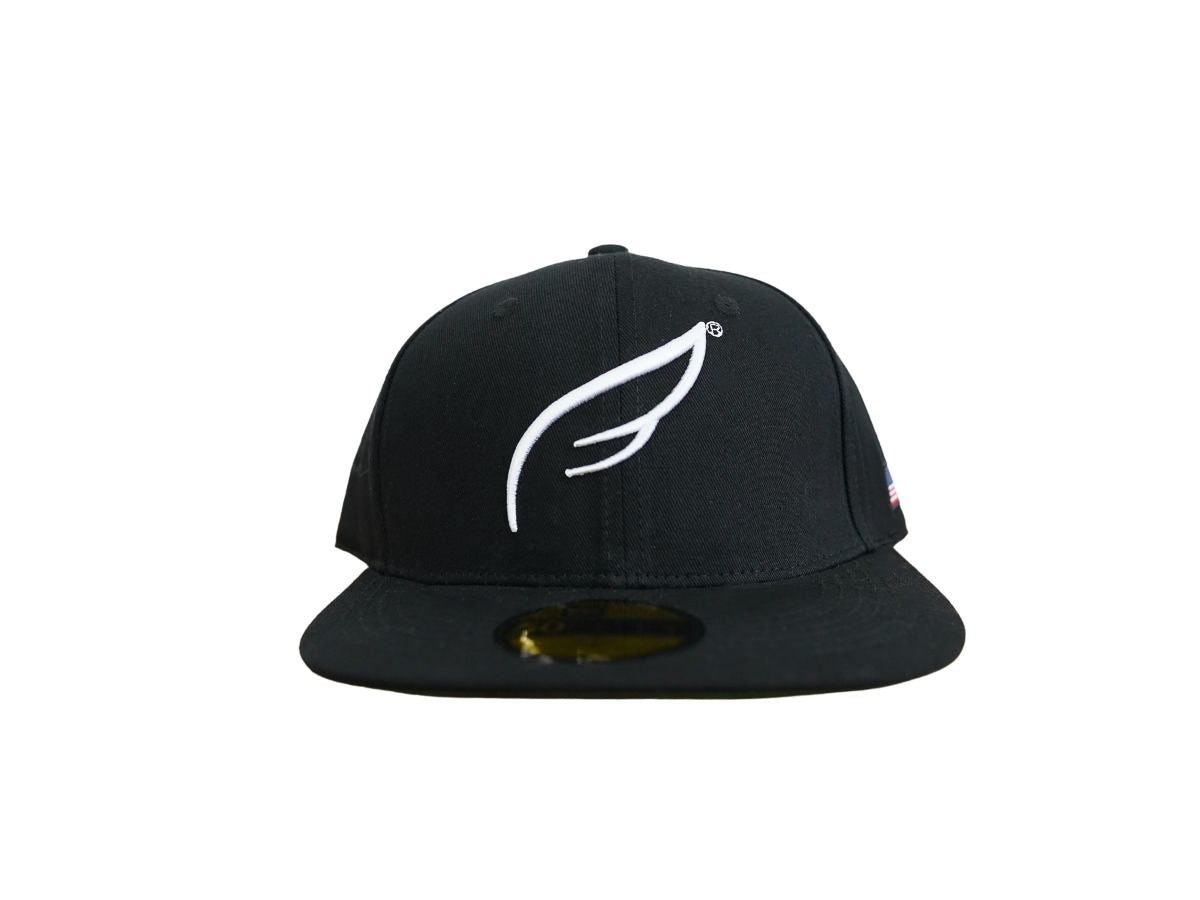 The Fam Angel Wing Snapback in Black features a 3D-raised embroidered logo in white at the front panels, a tonal script Fam logo on the wearer's right, and our Few Against Many logo flat-stitched above the back closure.