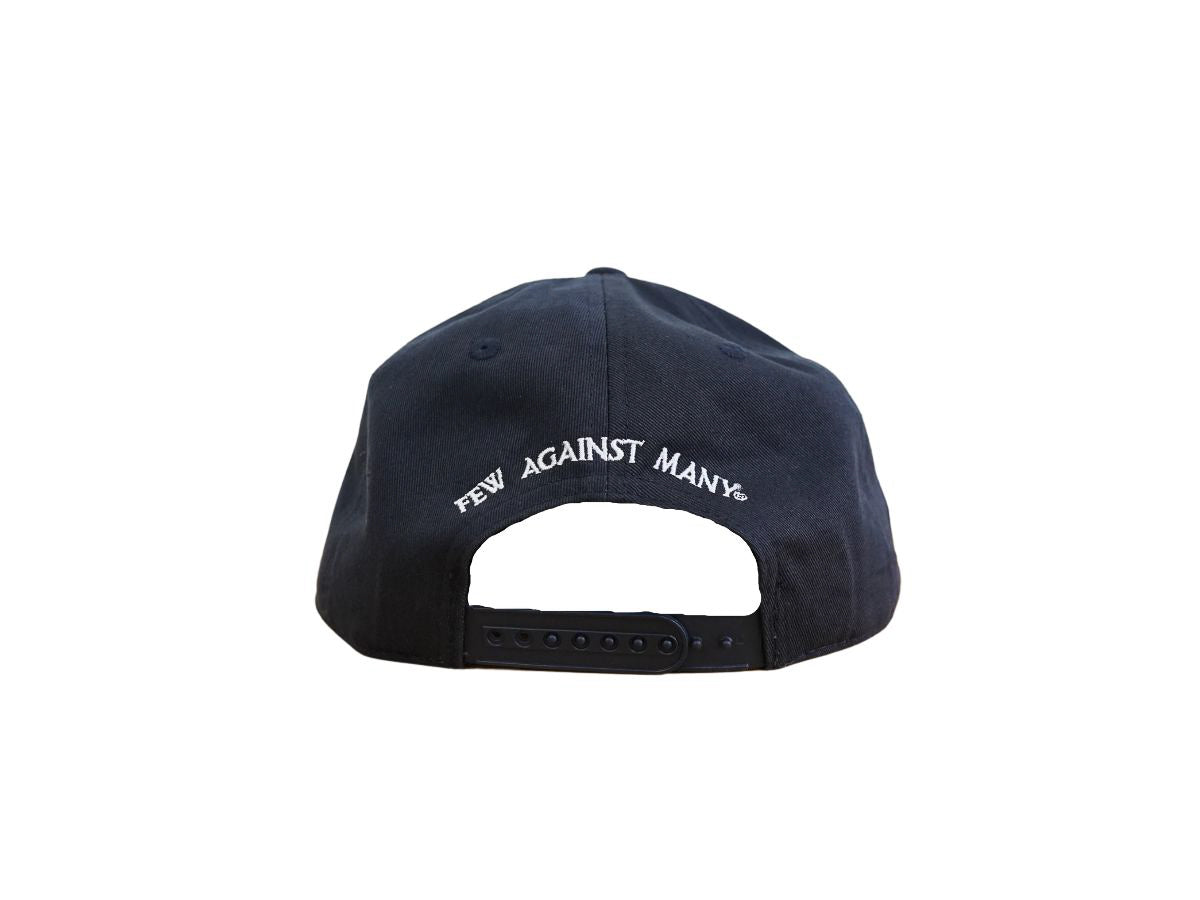 The Fam Angel Wing Snapback in Navy features a 3D-raised embroidered logo in white at the front panels, a tonal script Fam logo on the wearer's right, and our Few Against Many logo flat-stitched above the back closure.