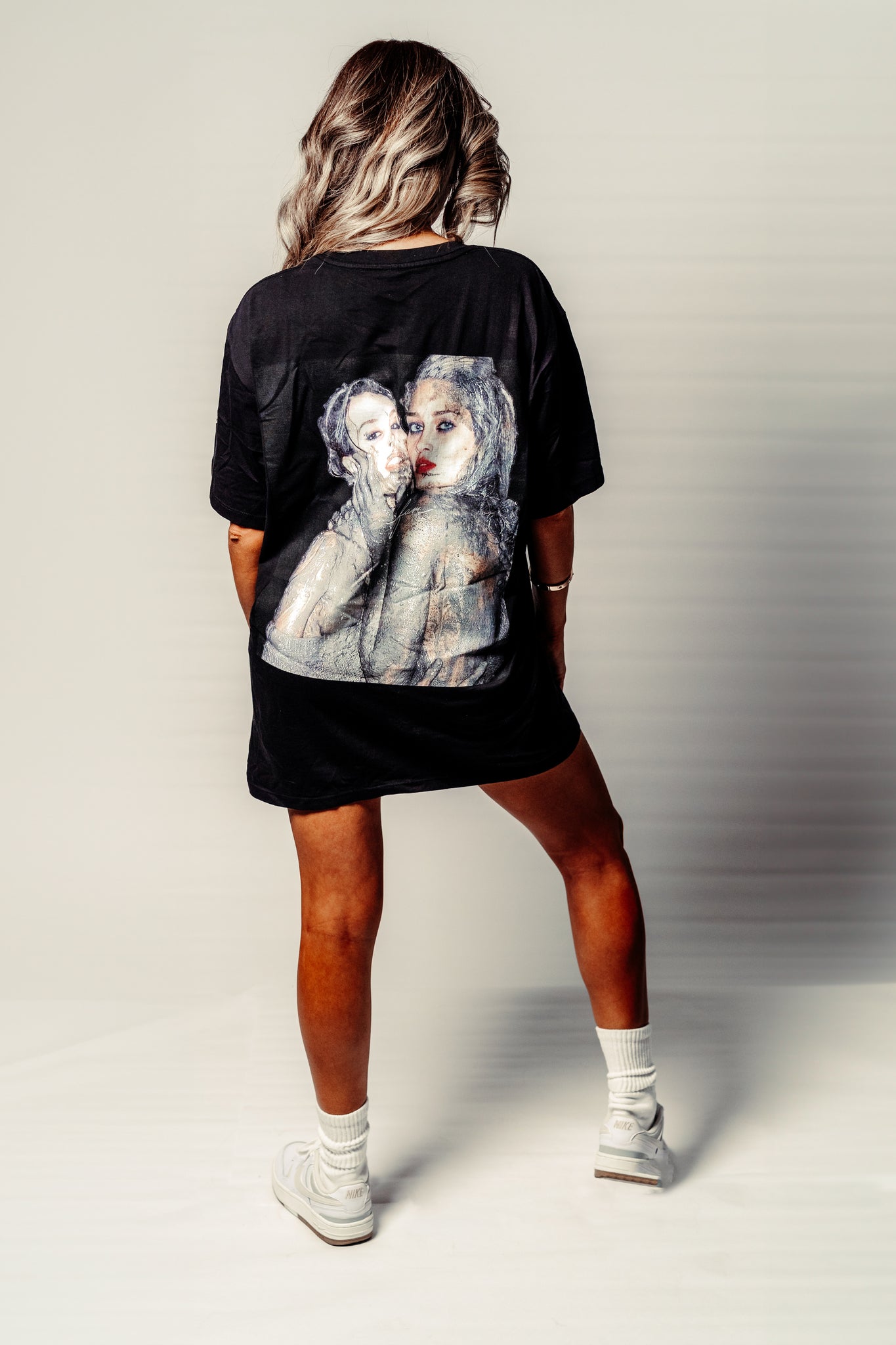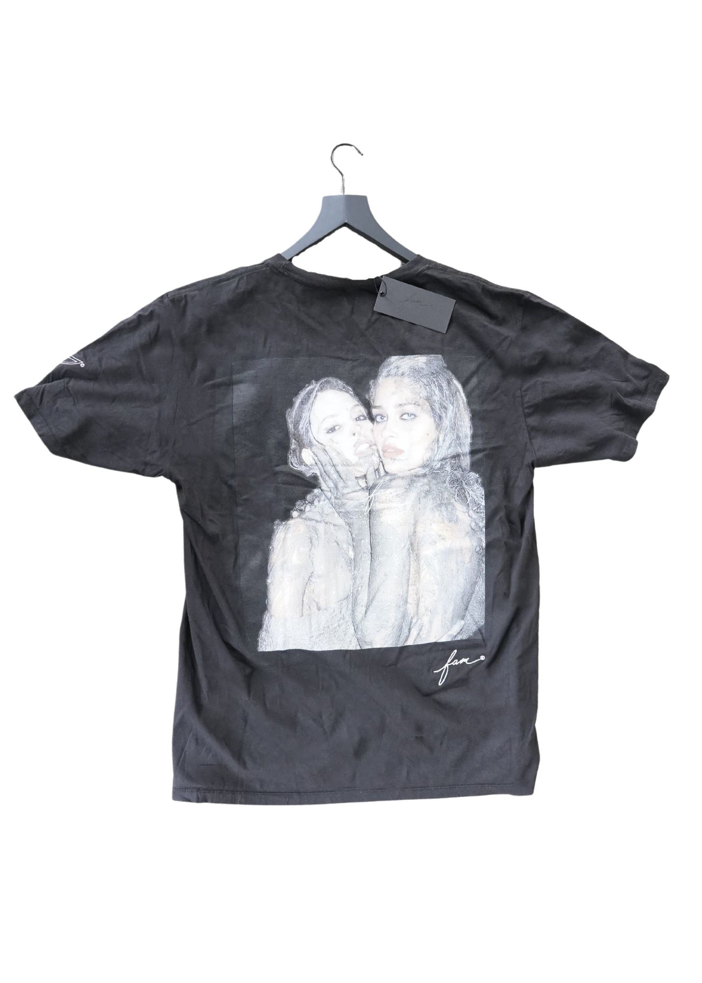 Black tee with Few Against Many embroidered on front. Iconic image DTG on back with script Fam logo embroidered bottom right.