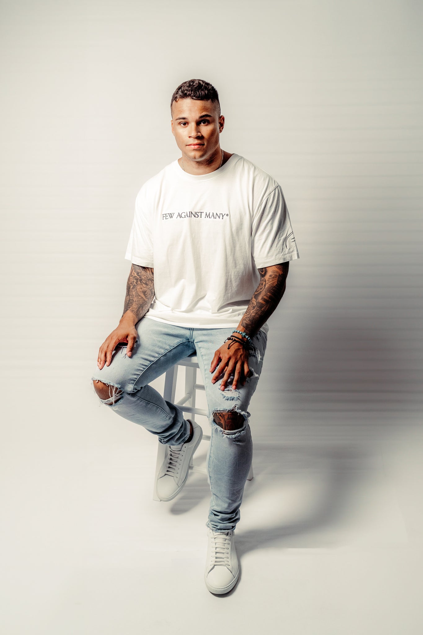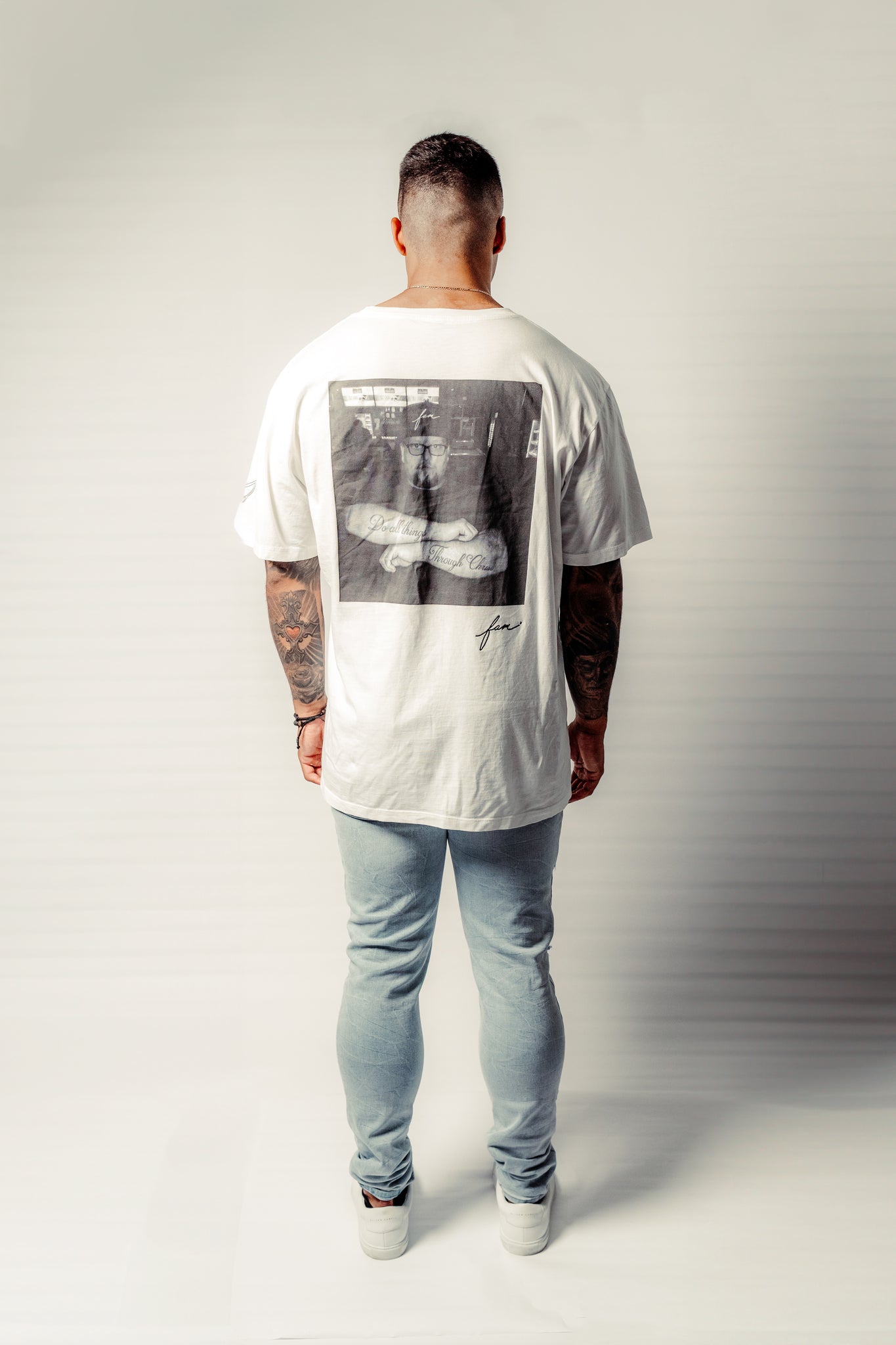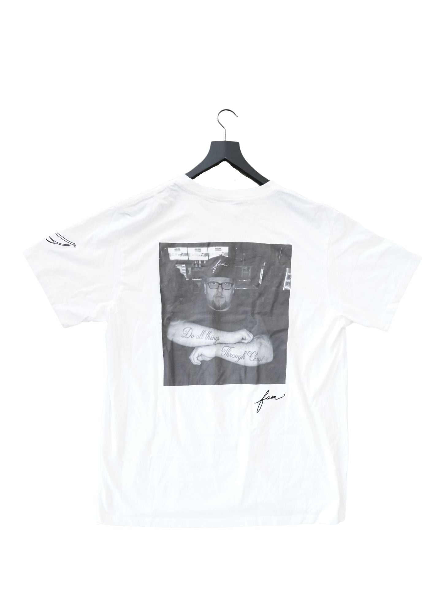 White tee with Few Against Many embroidered on front. "All Things Through Chris" DTG on back with script Fam logo embroidered bottom right.